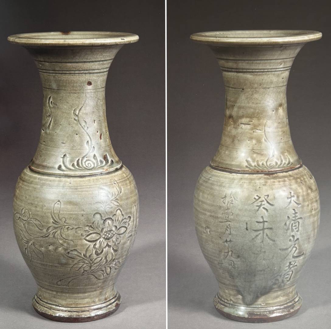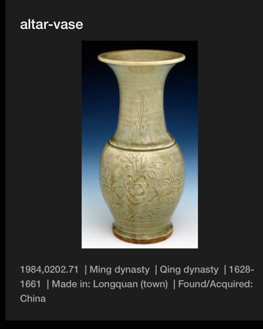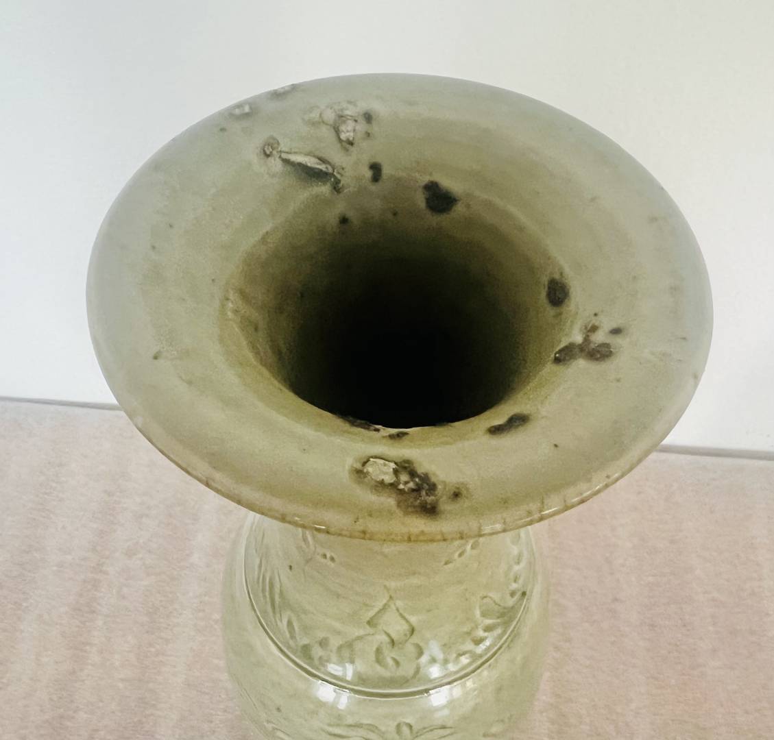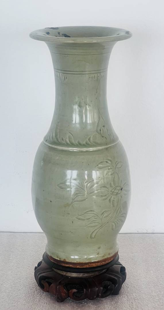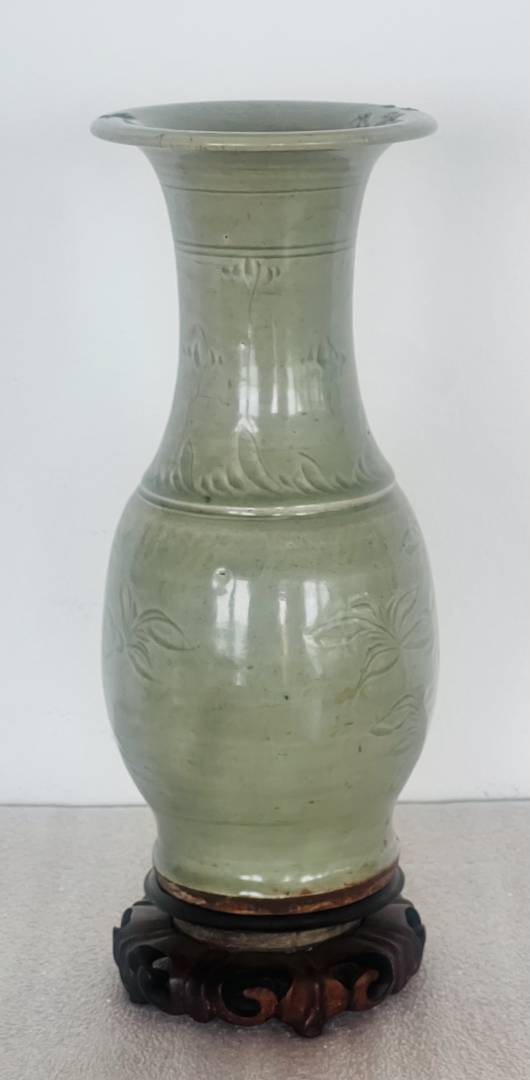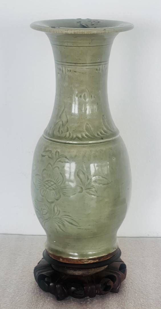 Your vase is Longquan celadon, the shape in Chinese is called ‘fengwei zun’, which translates to ‘phoenix-tail vase’ in the West. The carved floral sprays are probably peonies, as you thought …
