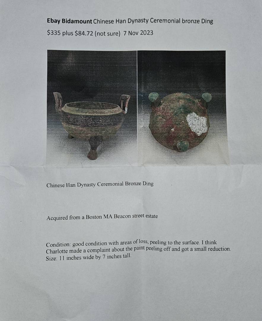 You included the caveats about the ding bronze so please don't worry about it; I knew I was taking a risk. Lesson learned! I think the other "ancient" bronze is also new; I may donate them as a pair. Chalk it up to tuition, and all that.