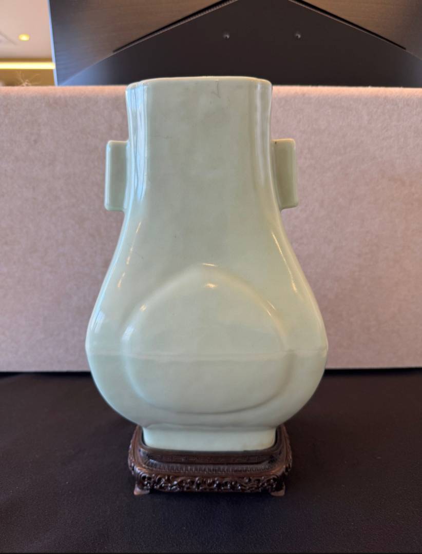 Beautiful color, celadon is so soothing. The fitted stand looks well carved. The horizontal line near the base, was it made in two pieces?