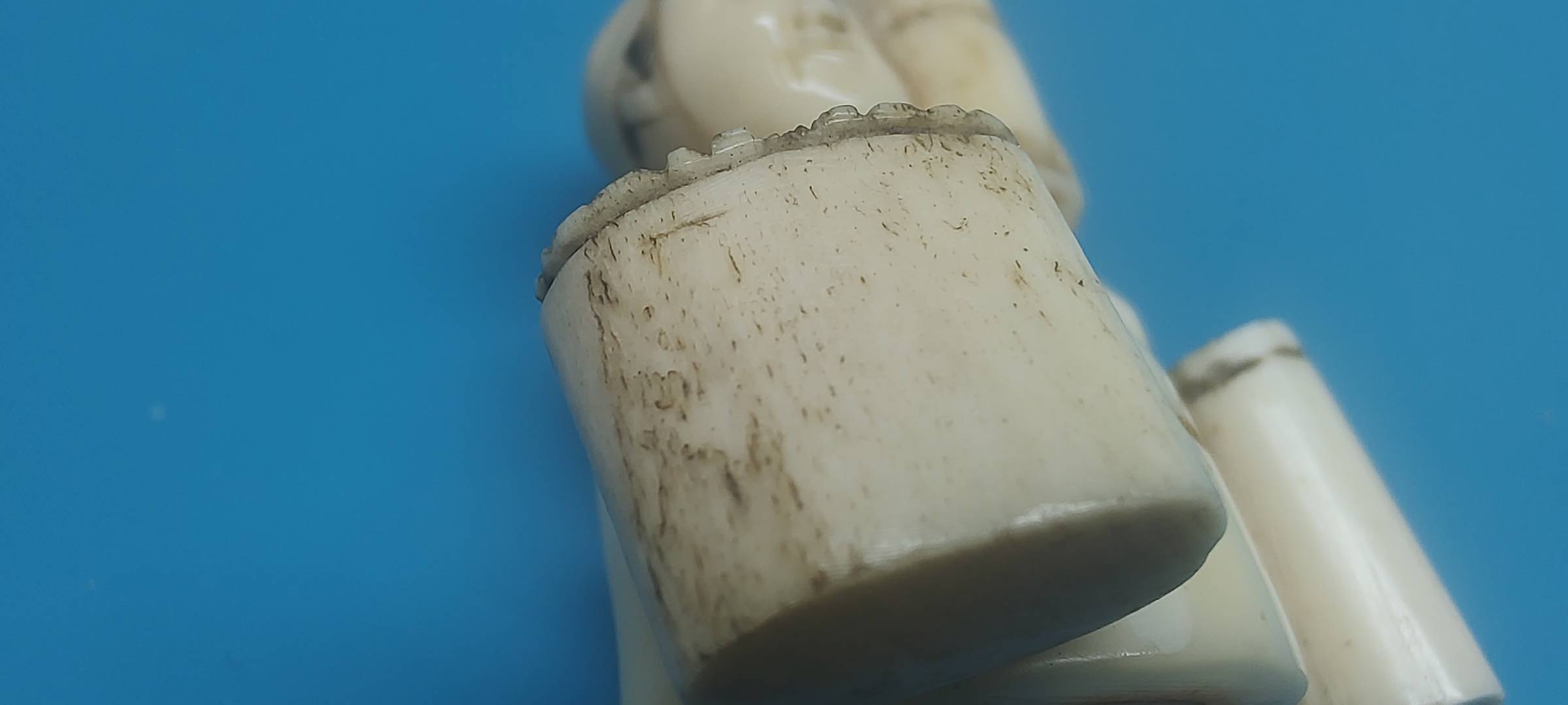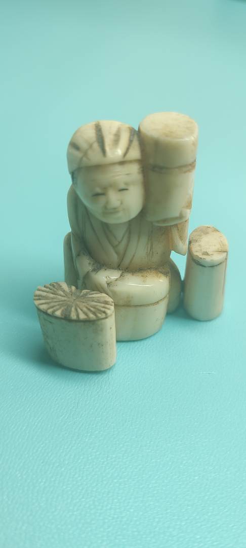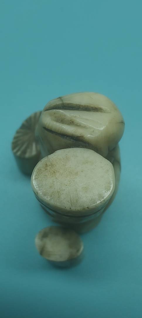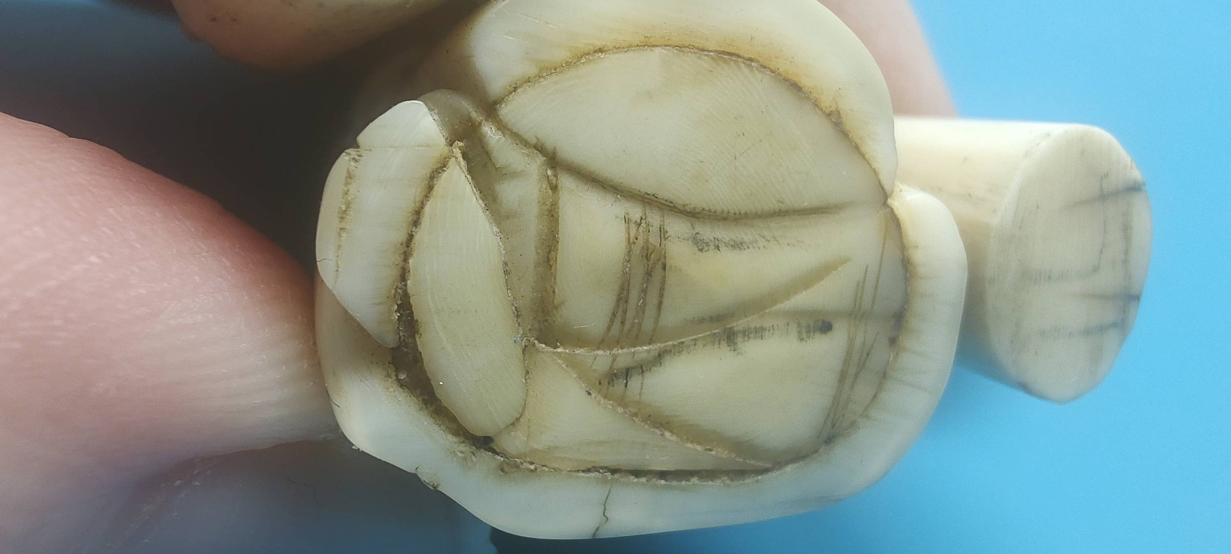 Also, is it ivory or bone? I can see concentric lines at the base of figure and at the top but also and black dots and marks in areas like blood vessels - only in one area of the whole netsuke (Haversian system) making me think it's bone. However , I see from research online that hippo and sperm whale also have these concentric lines almost like like tree rings.