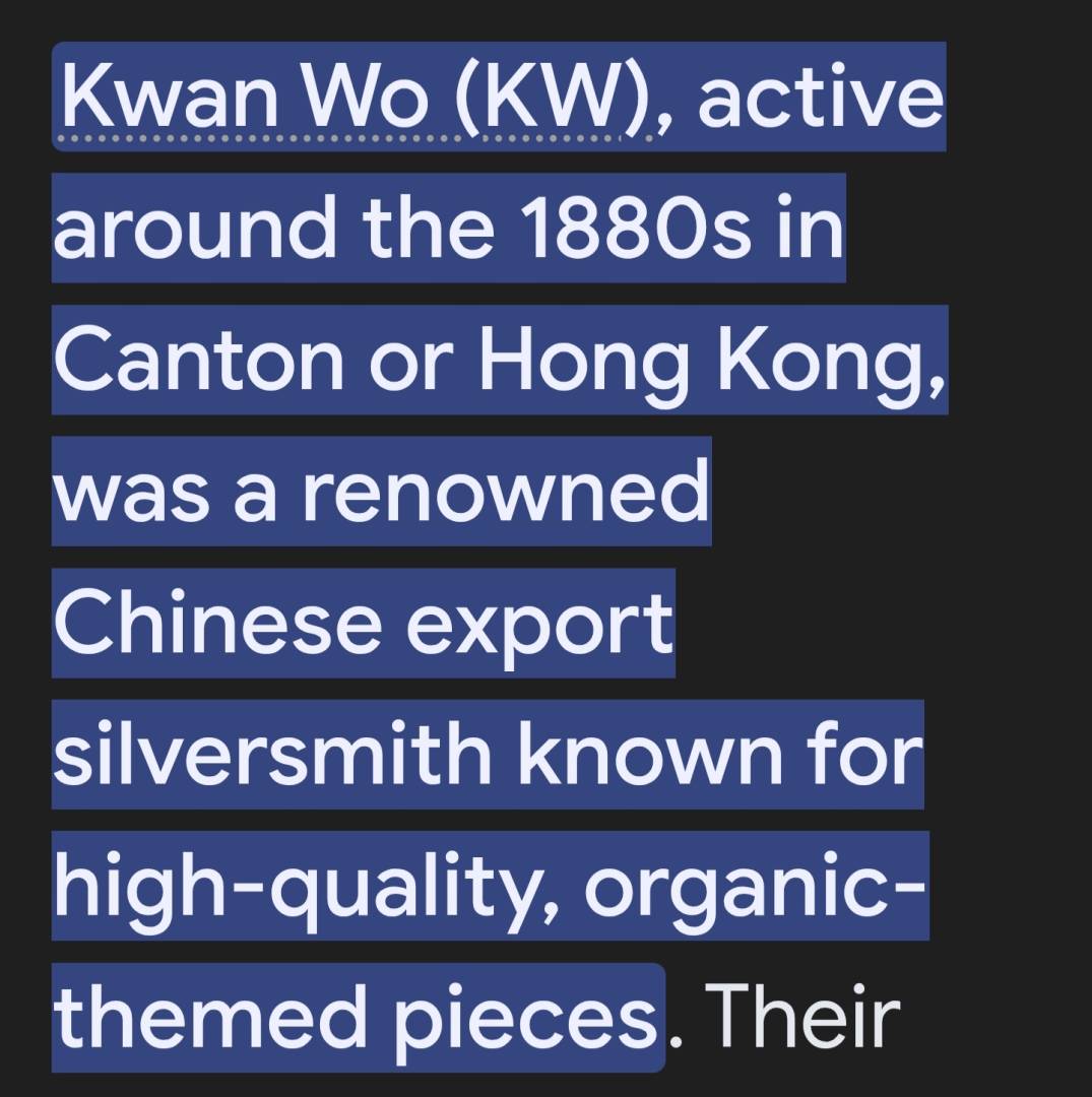 There is also a page on Kwan Wo Canton and Hong Kong through 1940 on the Chinese Export Silvermarks book in the Bidamount Reference Bookcase, just type silver in the search box on the Reference Bookcase page and the marks alphabetical in the yellow book that will come up with a few others, contains examples of mark and his work.