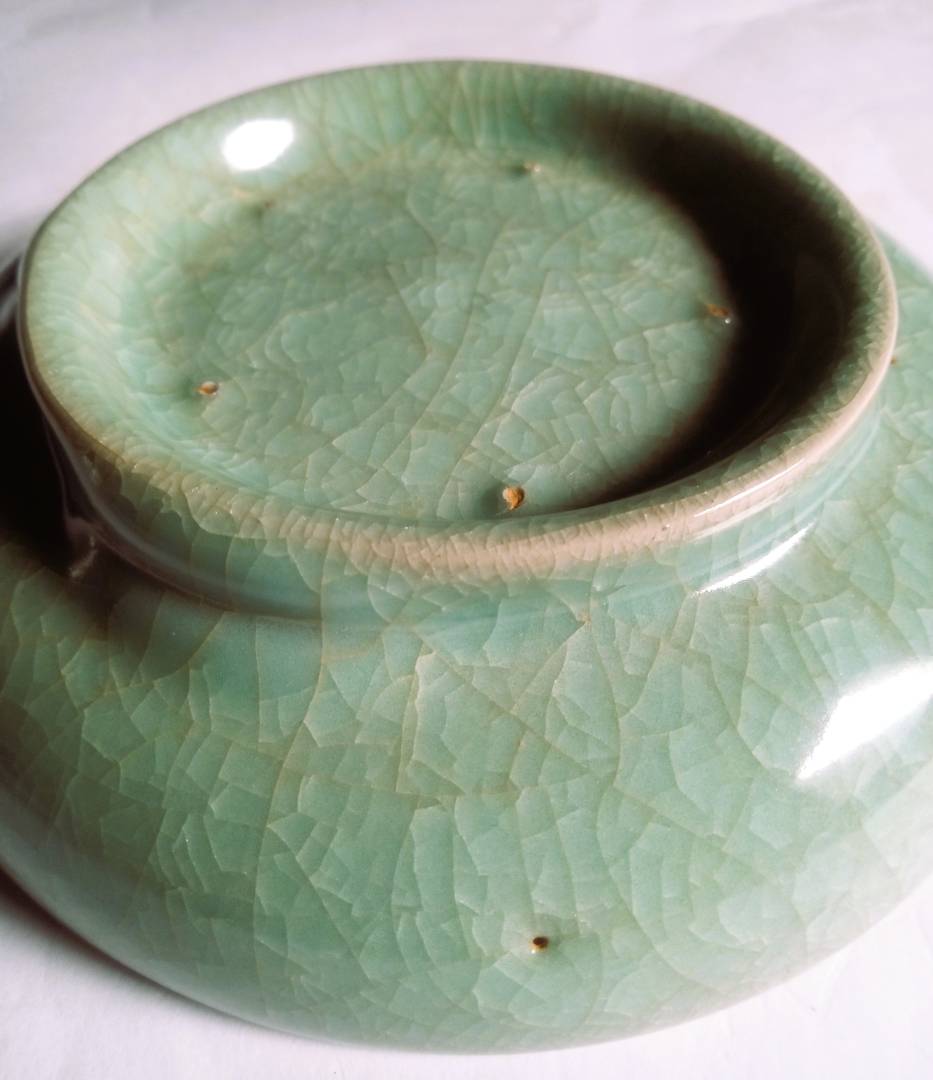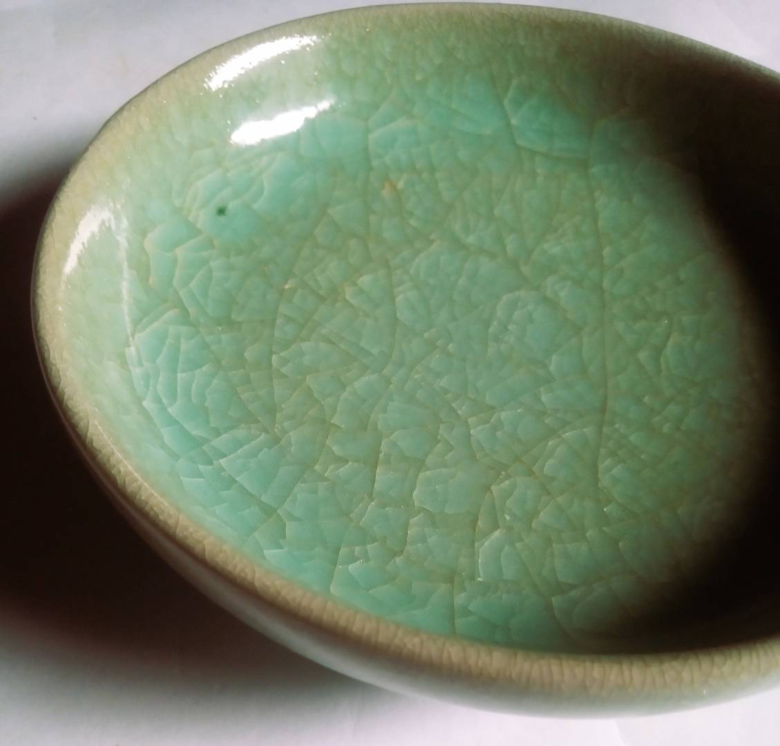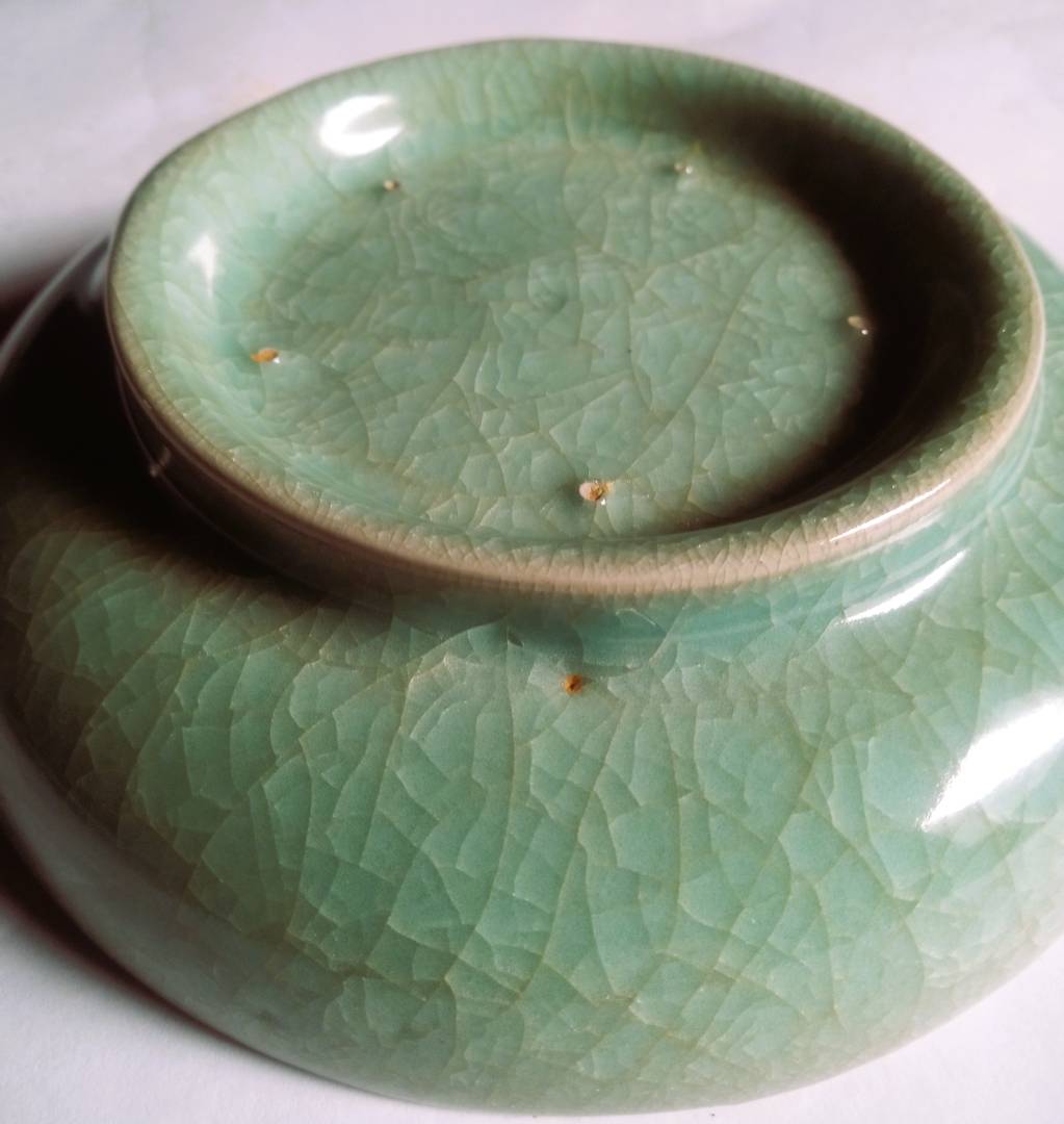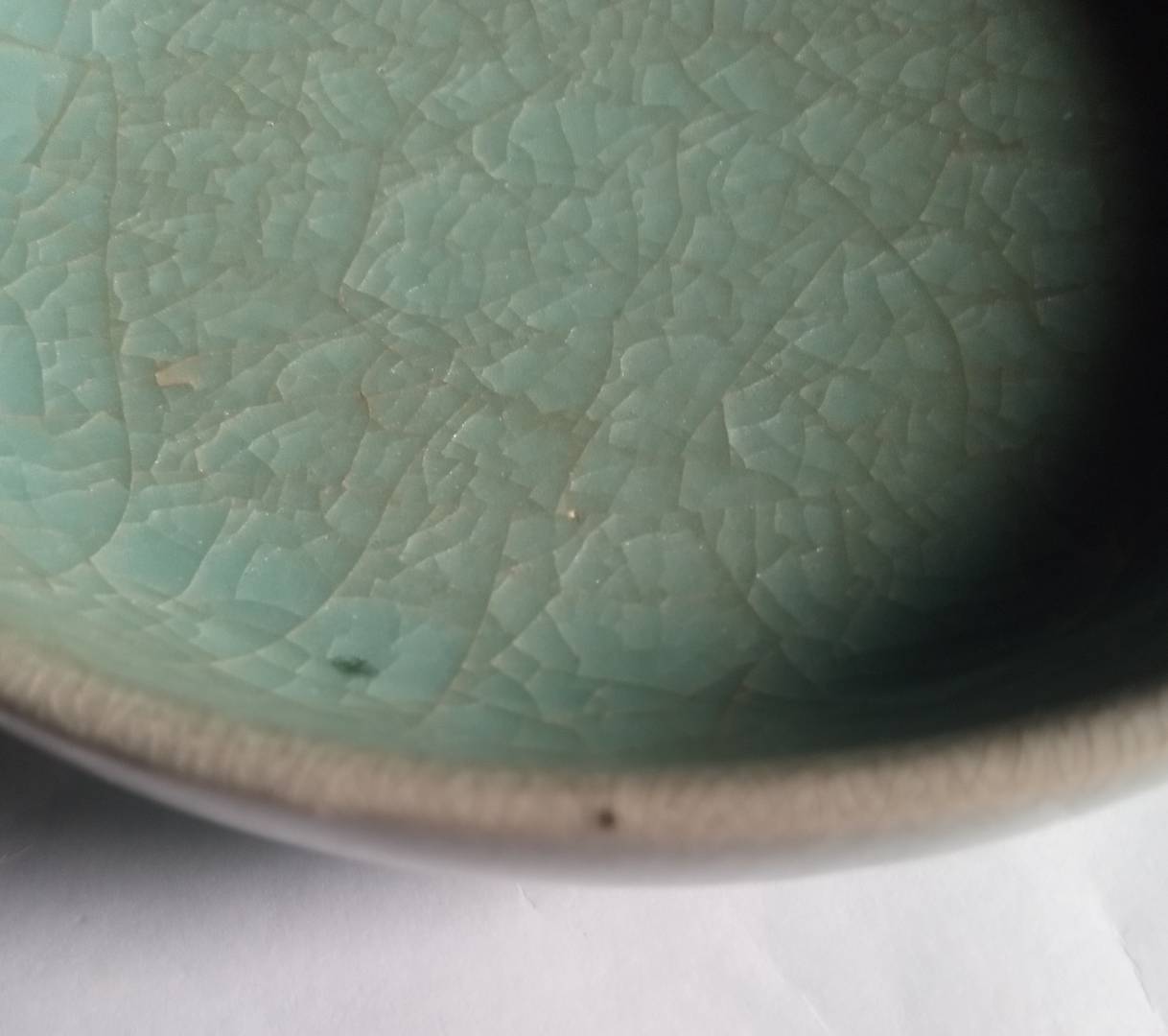 I have tried to capture as much detail as I can and this piece actually appears to change color from Bluish to Greenish depending on the light you are in, also under a magnifier it actually appears like shattered ice in the whole piece-close ups of the spur marks and the pinkish tone at the edges throughout-this was acquired with some furniture from along with other pieces of Chinese porcelain one of which has a true label from C.T. LOO Of Paris which I have . The inventory label is still on the underside of the table from which the porcelain was acquired. see pics-one of the pictures shows it and the table with an Export tea caddy on it. The last picture shows the C.T. LOO labeled bowl bowl to the right of part of the collection as I acquired it and this bowl with other early Chinese pieces. Obviously a genuine collection.
