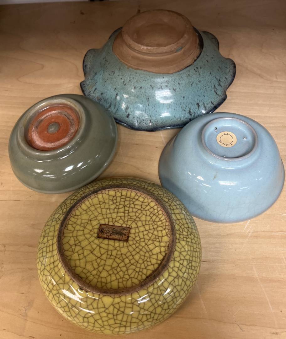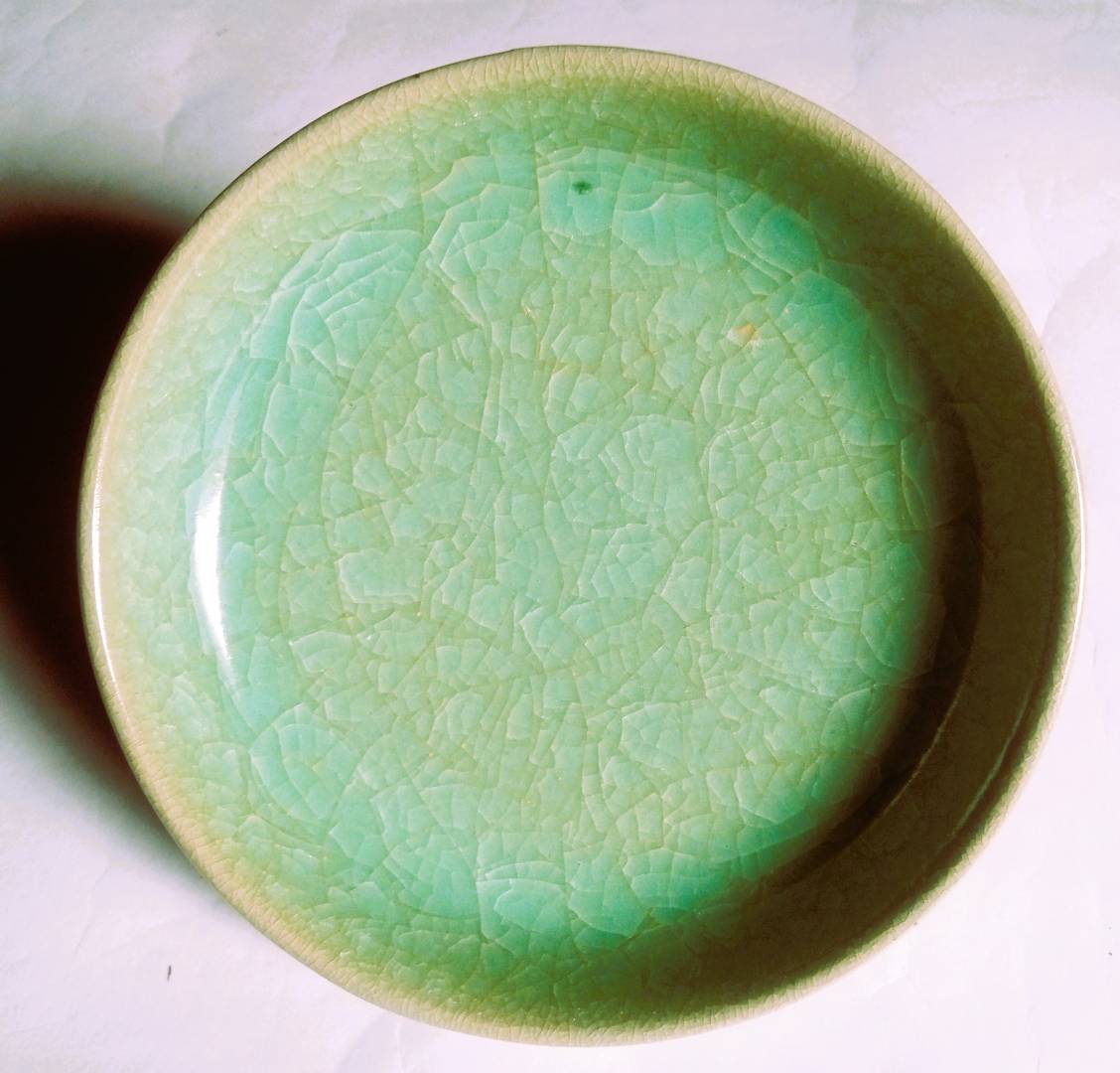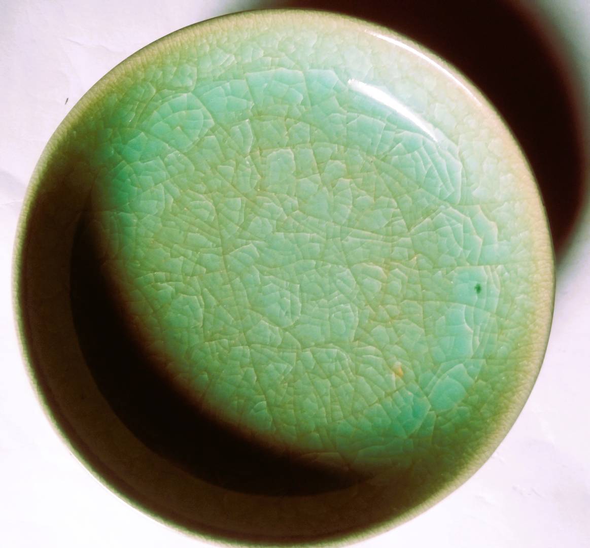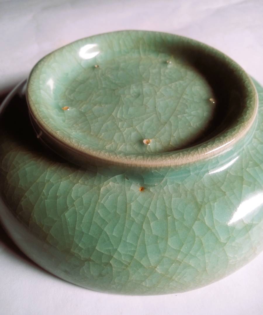 I have tried to capture as much detail as I can and this piece actually appears to change color from Bluish to Greenish depending on the light you are in, also under a magnifier it actually appears like shattered ice in the whole piece-close ups of the spur marks and the pinkish tone at the edges throughout-this was acquired with some furniture from along with other pieces of Chinese porcelain one of which has a true label from C.T. LOO Of Paris which I have . The inventory label is still on the underside of the table from which the porcelain was acquired. see pics-one of the pictures shows it and the table with an Export tea caddy on it. The last picture shows the C.T. LOO labeled bowl bowl to the right of part of the collection as I acquired it and this bowl with other early Chinese pieces. Obviously a genuine collection.