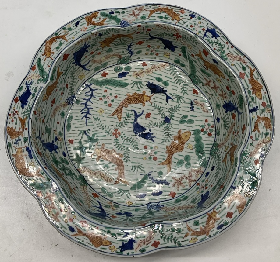 If this proves indeed to be a mark and period basin, you have done exceptionally well to have acquired it at the price indicated in your catalogue annotation. Even though heavily restored, it is such a rarity - possibly a unique rarity - that that fact alone should be enough to counterbalance substantially the drawbacks posed by its damaged state.