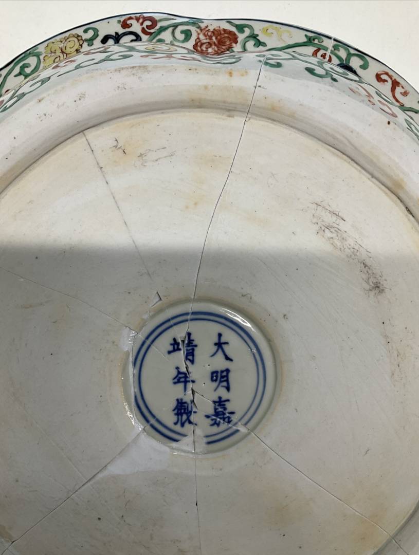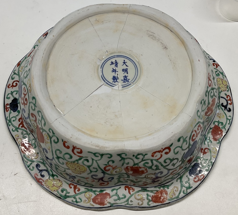 First, I wonder why the auction house in which you found the basin thought it to be later than its reign mark would indicate. This strikes me as curious, since the auction house was clearly aware that the mark indicated the Jiajing reign; it was therefore not utterly unacquainted with matters Chinese. (I note that you did not mention the name of the auction house in which you found it. Someone's judgement obviously lay behind the opinion expressed in the catalogue; I found myself wondering whose this may have been, whether it was the product of in-house expertise, or whether it had come from an external consultant.)