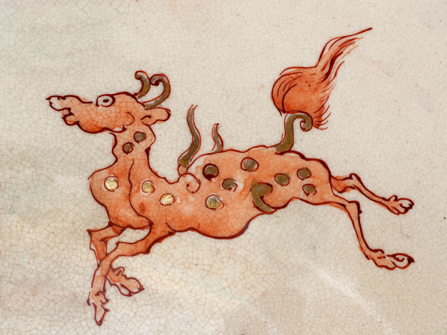I am intrigued by the unusual combination of decorative styles - the inner decoration bears no relationship to the outer. I just love the humour in the depiction of a Kilin - which is why I acquired it in the first place - it is actually a stylized image of a real mammal, but can you guess what that is? The surprising answer makes complete sense. The shi-shi is equally amusing. The painter had an assured and practiced hand unlike that of whoever painted the rather crudely drafted, Ko-Kutani style decoration on the outside.